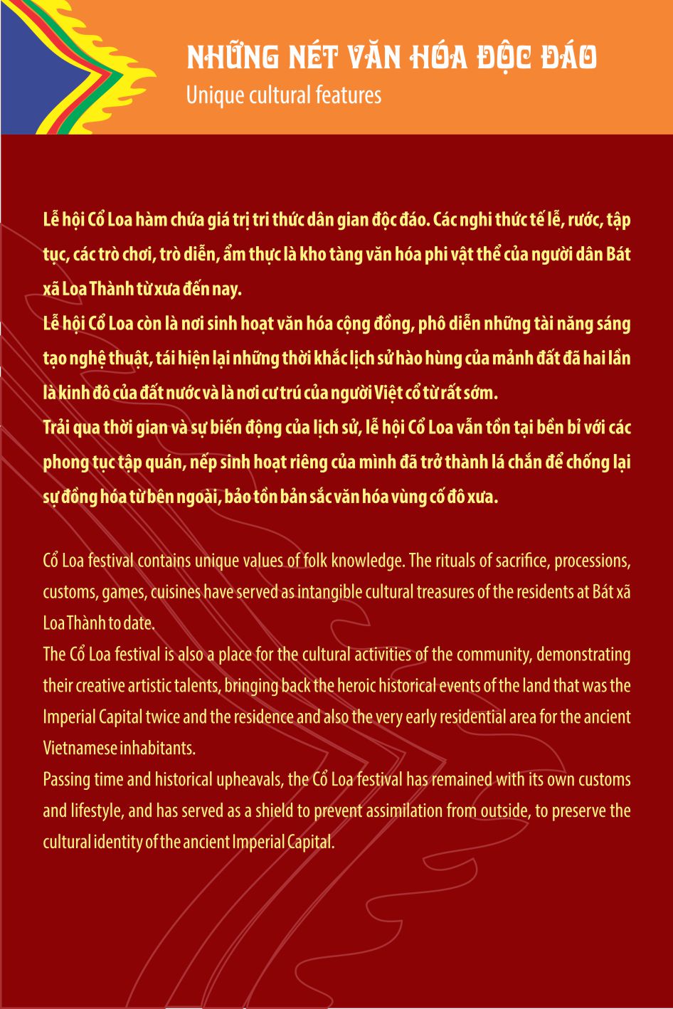 Lễ hội Cổ Loa còn là nơi sinh hoạt văn hóa cộng đồng, phô diễn những tài năng sáng tạo nghệ thuật, tái hiện lại những thời khắc lịch sử hào hùng của mảnh đất đã hai lần là kinh đô của đất nước và là nơi cư trú của người Việt cổ từ rất sớm.