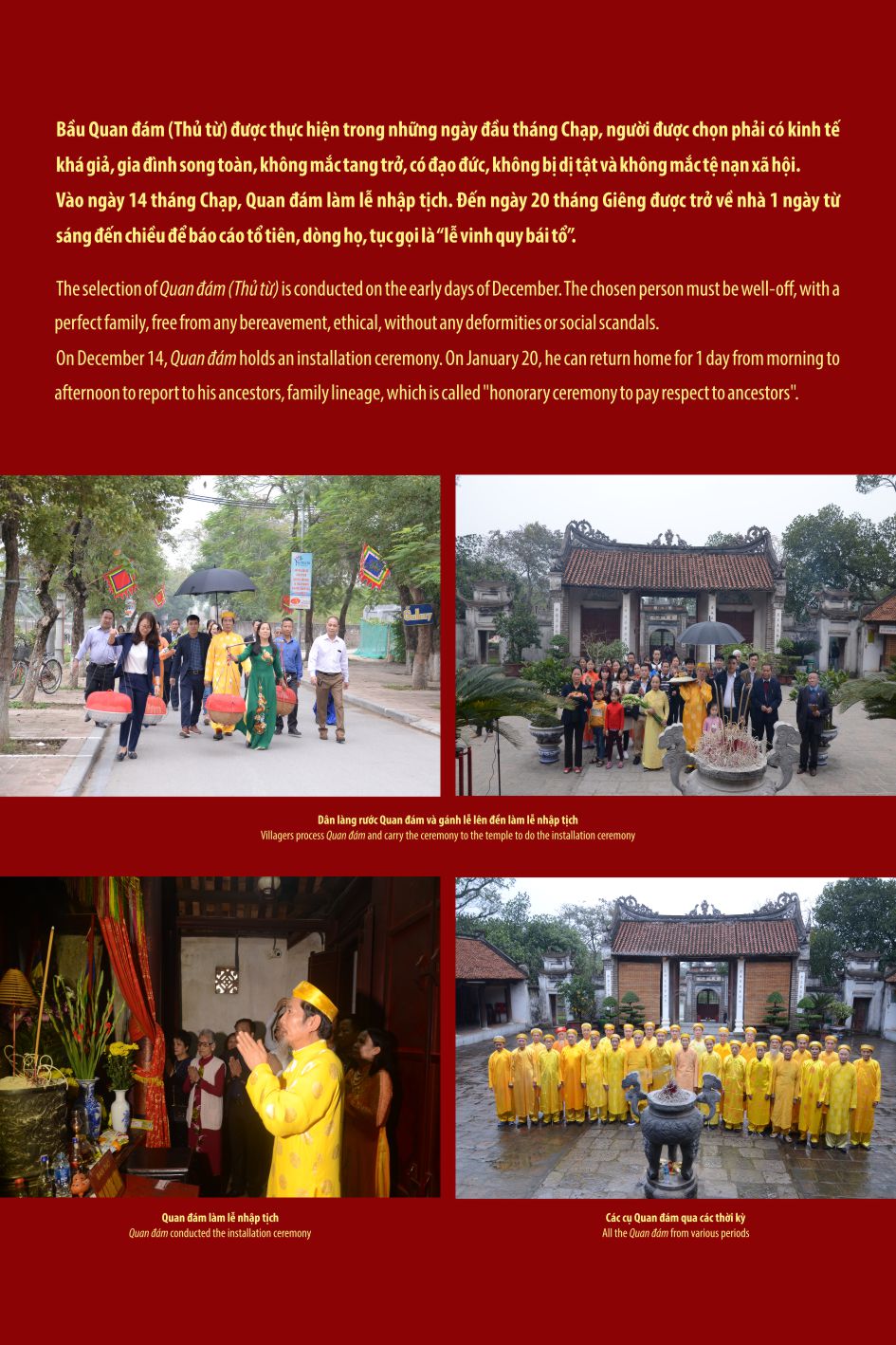 Bầu Quan đám (Thủ từ) được thực hiện trong những ngày đầu tháng Chạp, người được chọn phải có kinh tế khá giả, gia đình song toàn, không mắc tang trở, có đạo đức, không bị dị tật và không mắc tệ nạn xã hội.