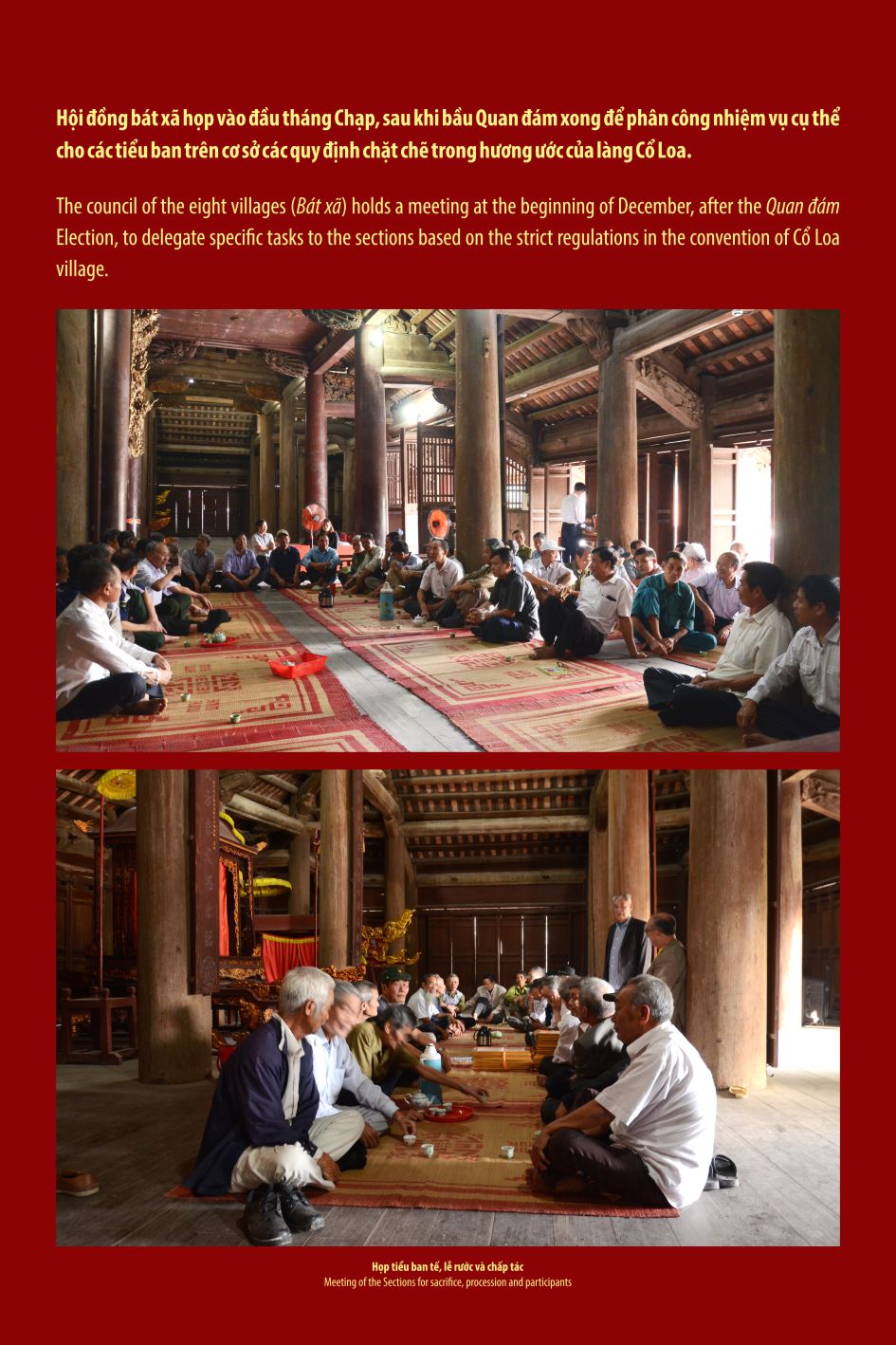 Hội đồng bát xã họp vào đầu tháng Chạp, sau khi bầu Quan đám xong để phân công nhiệm vụ cụ thể cho các tiểu ban trên cơ sở các quy định chặt chẽ trong hương ước của làng Cổ Loa.