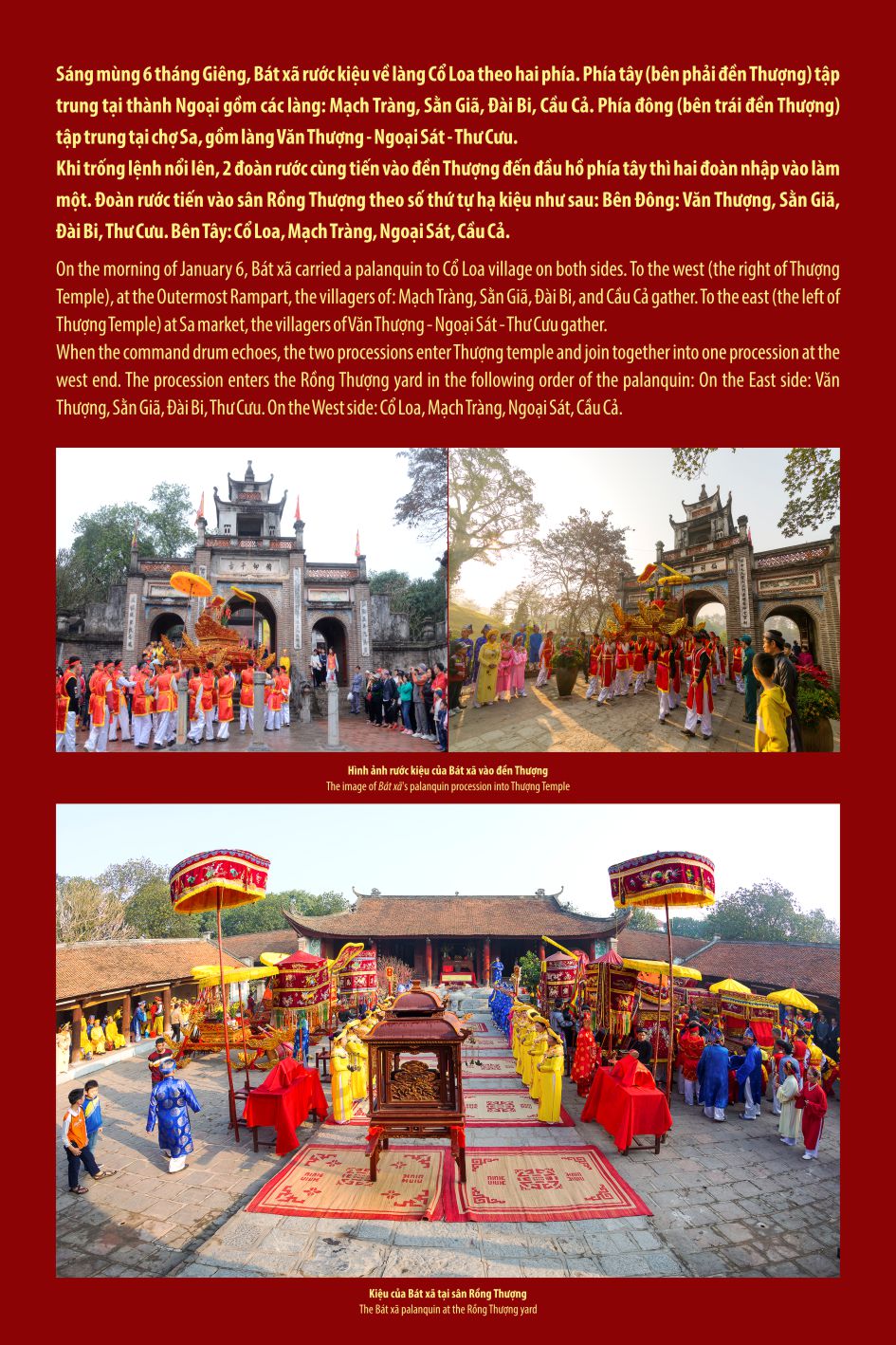 Sáng mùng 6 tháng Giêng, Bát xã rước kiệu về làng Cổ Loa theo hai phía. Phía tây (bên phải đền Thượng) tập trung tại thành Ngoại gồm các làng: Mạch Tràng, Sằn Giã, Đài Bi, Cầu Cả. Phía đông (bên trái đền Thượng) tập trung tại chợ Sa, gồm làng Văn Thượng - Ngoại Sát - Thư Cưu.