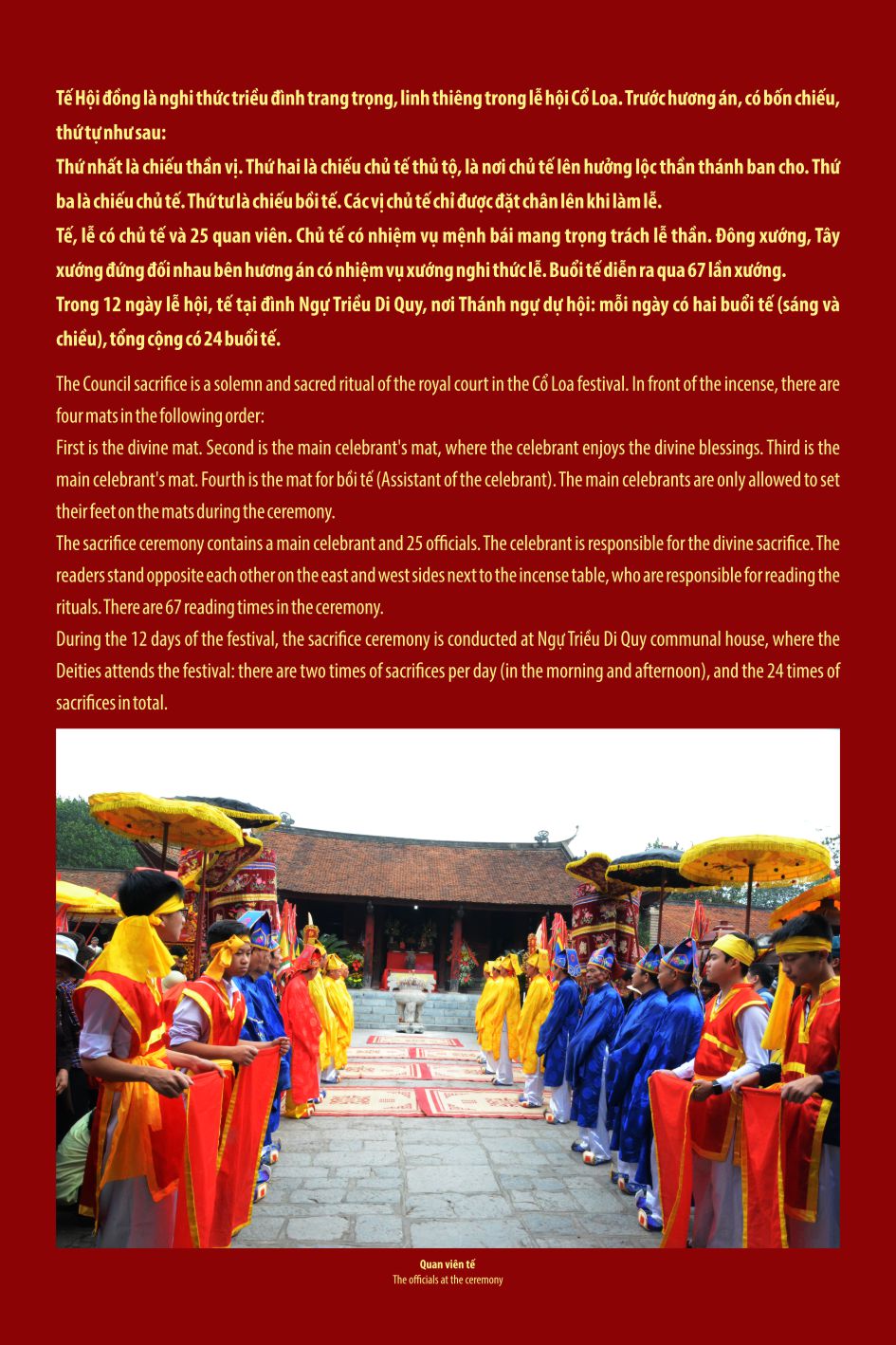 Tế Hội đồng là nghi thức triều đình trang trọng, linh thiêng trong lễ hội Cổ Loa. Trước hương án, có bốn chiếu, thứ tự như sau: