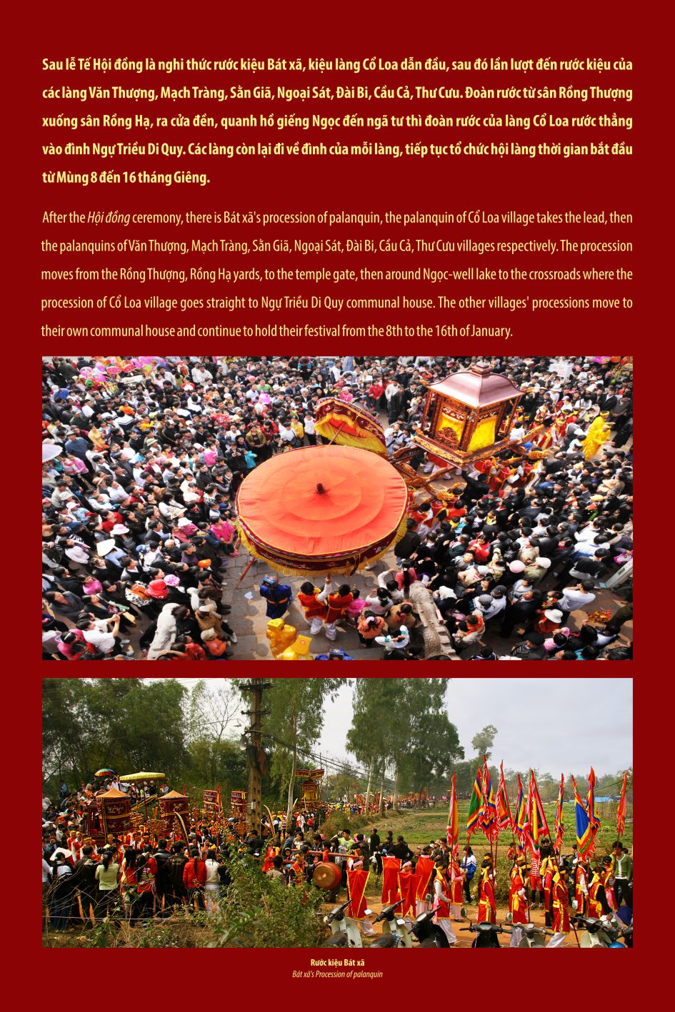 Sau lễ Tế Hội đồng là nghi thức rước kiệu Bát xã, kiệu làng Cổ Loa dẫn đầu, sau đó lần lượt đến rước kiệu của các làng Văn Thượng, Mạch Tràng, Sằn Giã, Ngoại Sát, Đài Bi, Cầu Cả, Thư Cưu. Đoàn rước từ sân Rồng Thượng xuống sân Rồng Hạ, ra cửa đền, quanh hồ giếng Ngọc đến ngã tư thì đoàn rước của làng Cổ Loa rước thẳng vào đình Ngự Triều Di Quy. Các làng còn lại đi về đình của mỗi làng, tiếp tục tổ chức hội làng thời gian bắt đầu từ Mùng 8 đến 16 tháng Giêng.