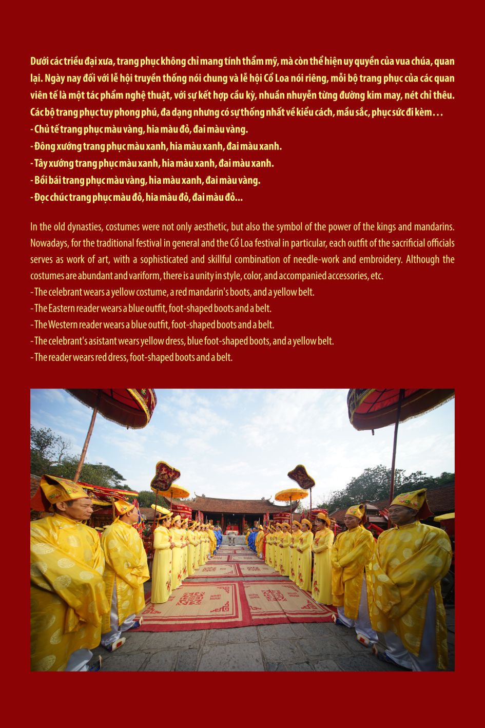 Dưới các triều đại xưa, trang phục không chỉ mang tính thẩm mỹ, mà còn thể hiện uy quyền của vua chúa, quan lại. Ngày nay đối với lễ hội truyền thống nói chung và lễ hội Cổ Loa nói riêng, mỗi bộ trang phục của các quan viên tế là một tác phẩm nghệ thuật, với sự kết hợp cầu kỳ, nhuần nhuyễn từng đường kim may, nét chỉ thêu. Các bộ trang phục tuy phong phú, đa dạng nhưng có sự thống nhất về kiểu cách, mầu sắc, phục sức đi kèm…