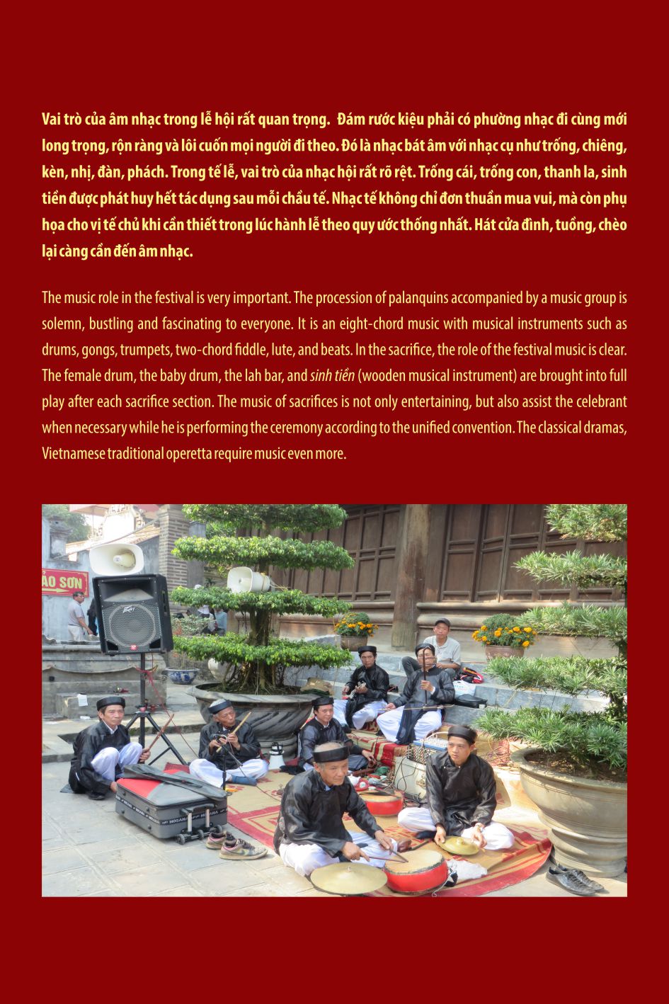 Vai trò của âm nhạc trong lễ hội rất quan trọng. Đám rước kiệu phải có phường nhạc đi cùng mới long trọng, rộn ràng và lôi cuốn mọi người đi theo.