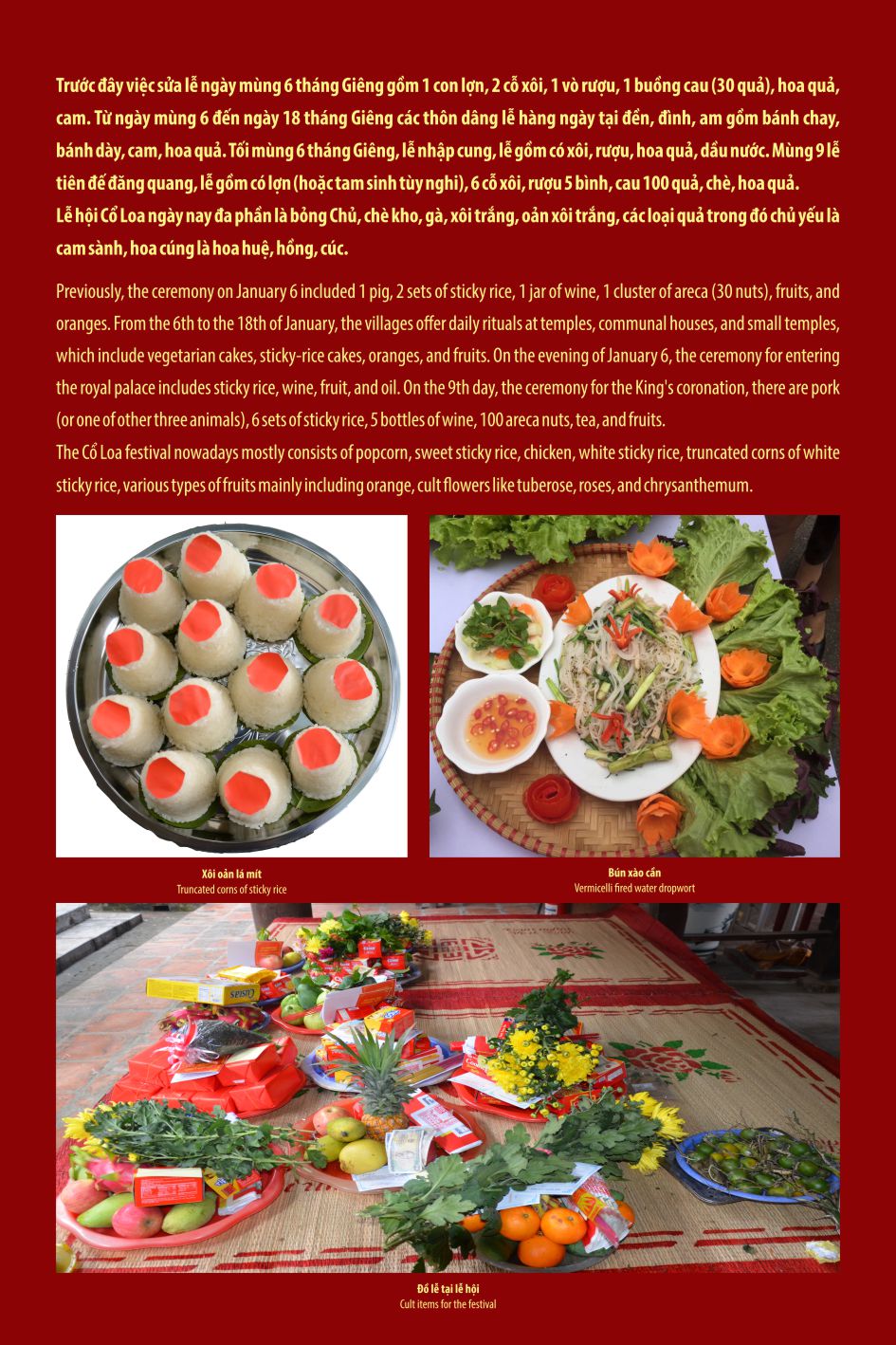 Lễ hội Cổ Loa ngày nay đa phần là bỏng Chủ, chè kho, gà, xôi trắng, oản xôi trắng, các loại quả trong đó chủ yếu là cam sành, hoa cúng là hoa huệ, hồng, cúc.