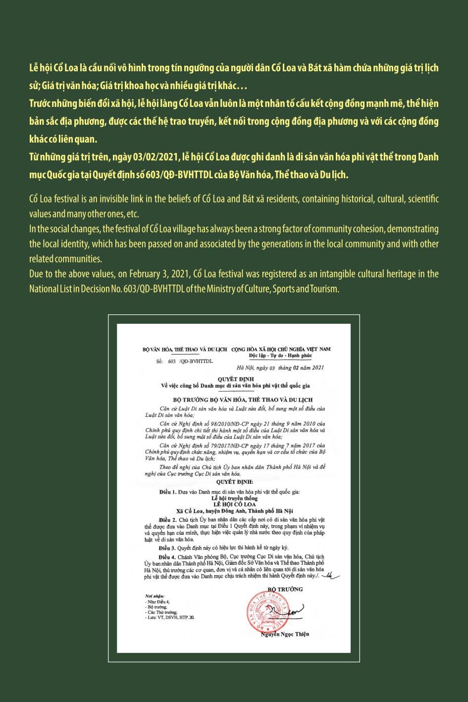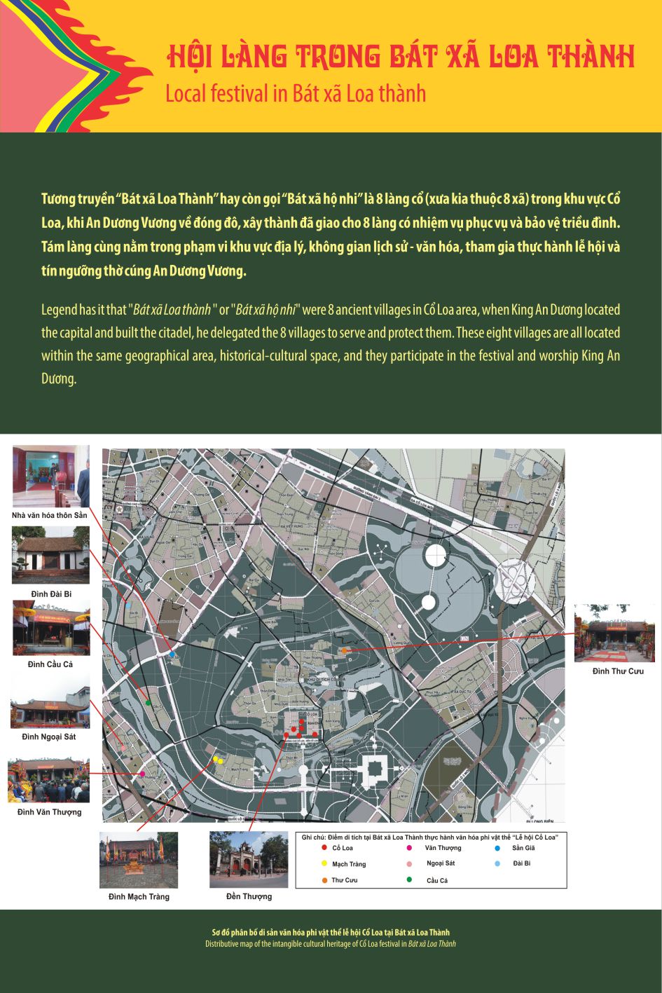 Lễ hội Cổ Loa hàm chứa giá trị tri thức dân gian độc đáo. Các nghi thức tế lễ, rước, tập tục, các trò chơi, trò diễn, ẩm thực là kho tàng văn hóa phi vật thể của người dân Bát xã Loa Thành từ xưa đến nay.