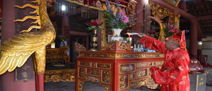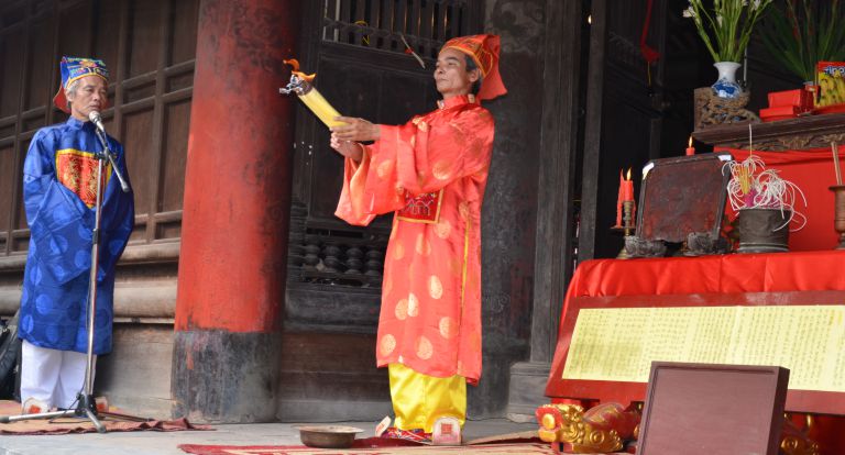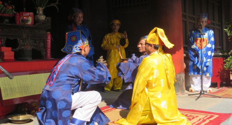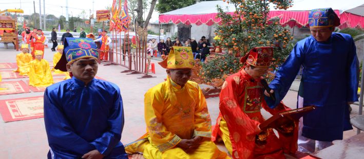 - Chủ tế trang phục màu vàng, hia màu đỏ, đai màu vàng.