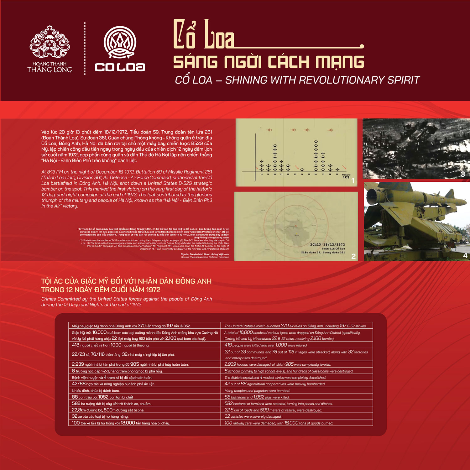 Từ ngày 20/12 - 28/12/1972, đế quốc Mỹ đã 4 lần dùng B52 rải thảm trên đất Cổ Loa, với 233 quả bom phá, bom sát thương và bom bi.