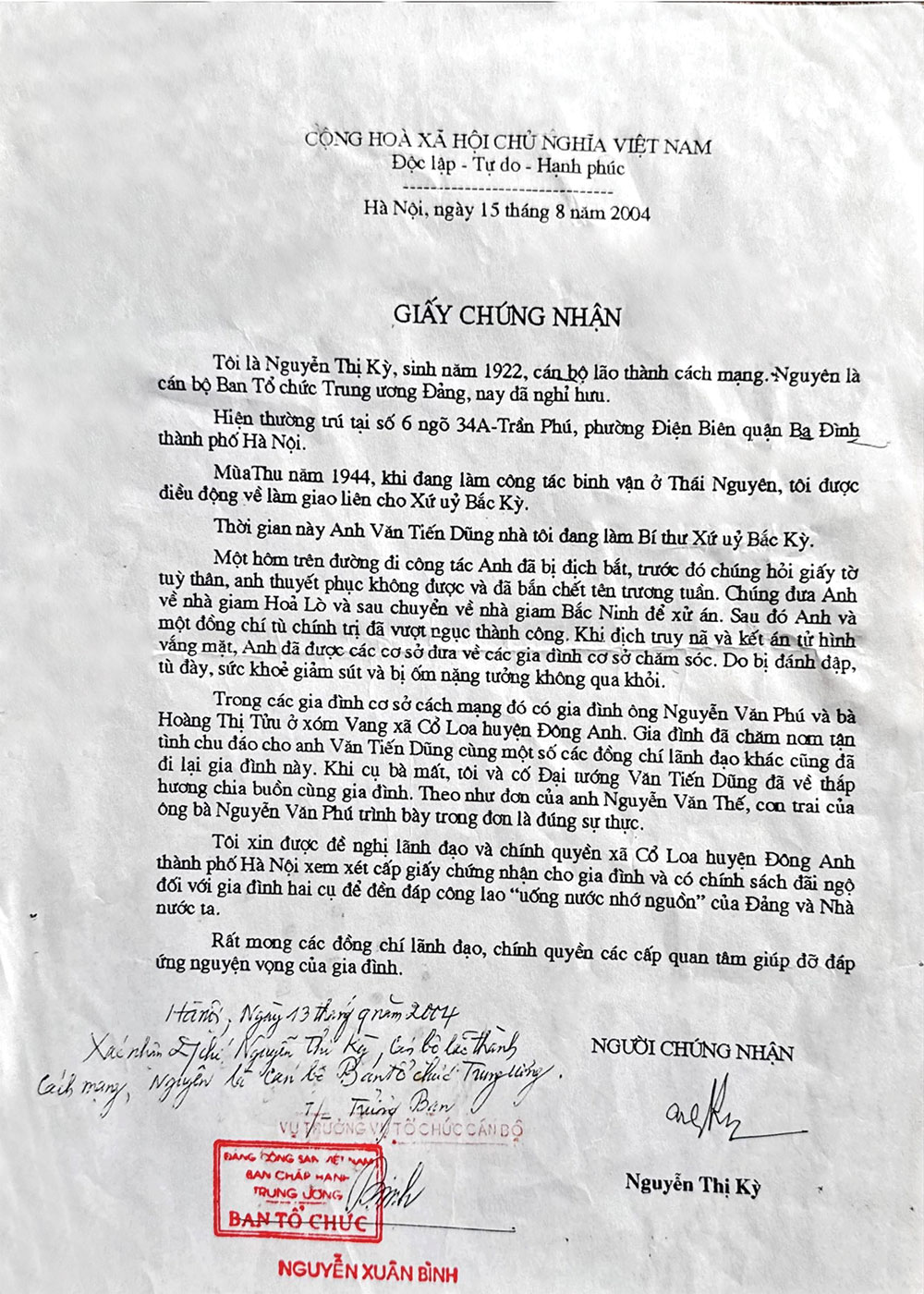 Xác nhận của đồng chí Nguyễn Thị Kỳ, vợ đồng chí Văn Tiến Dũng về việc gia đình ông Nguyễn Văn Phú và bà Hoàng Thị Tửu đã chăm non tận tình cho đồng chí Dũng