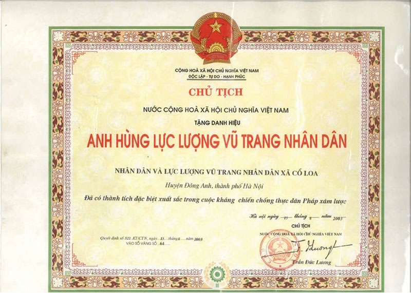 Nhân dân và lực lượng vũ trang nhân dân của xã Cổ Loa được trao tặng danh hiệu Anh hùng lực lượng vũ trang nhân dân trong cuộc kháng chiến chống thực dân Pháp