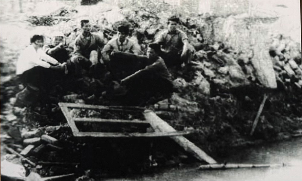 Chiến sĩ và nhân dân Đông Anh bên hố bom tại xã Uy Nỗ tháng 12/1972